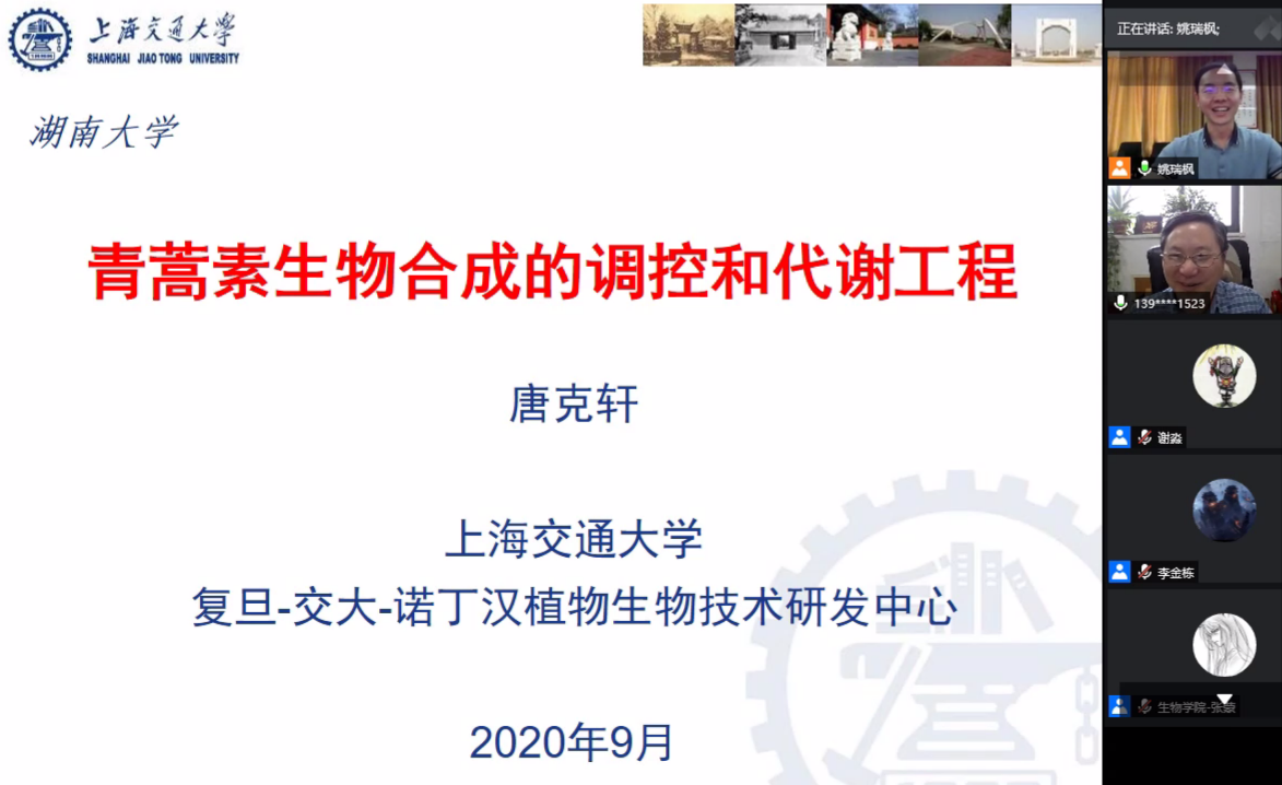 金秋九月,丹桂飘香。9月25日下午,上海交通大学特聘教授唐克轩老师应新葡官网3003新葡官方网站姚瑞枫教授邀请,在线作《青蒿素生物合成的的调控和代谢工程》的精彩报告,并与3003新葡官方网站师生进行了热烈的学术讨论与交流。本次报告由姚瑞枫教授主持,3003新葡官方网站相关老师及研究生近百人参加。