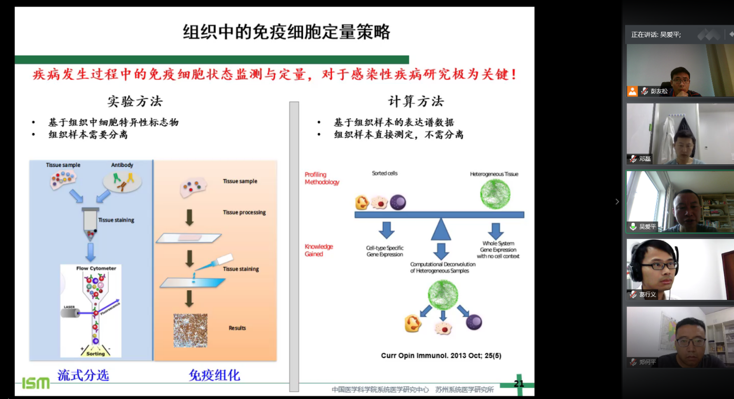 本次学术报告在线上进行。吴教授以流感、寨卡和新冠病毒为例,介绍了在重大病毒性传染病计算方法学和生物学发现两个方面的最新研究进展,主要包括三个方向的工作:1)以禽流感H7N9病毒和寨卡病毒为例介绍了新发病毒溯源的方法与策略;2)以新冠病毒和流感病毒为例介绍了病毒的变异研究方法及其潜在应用;3)病毒感染后的宿主免疫信号定量方法及应用。本次报告还特别邀请了与报告主题相关的四位老师(朱海珍教授,郑何平教授,葛行义教授,邓磊教授)作为与会嘉宾,促进大家在新发突发传染病方面的广泛讨论与交流。
