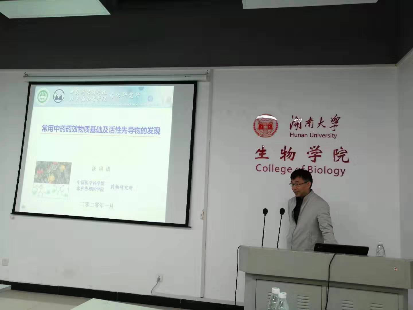 2020年1月6日上午,中国医学科学院、北京协和医学院药物所张培成教授应邀来新葡官网进行学术交流与访问,并作了精彩的学术报告,报告题目为“常用中药药效物质基础及活性先导物发现”。本次报告由3003新葡官方网站郑金海副教授主持。