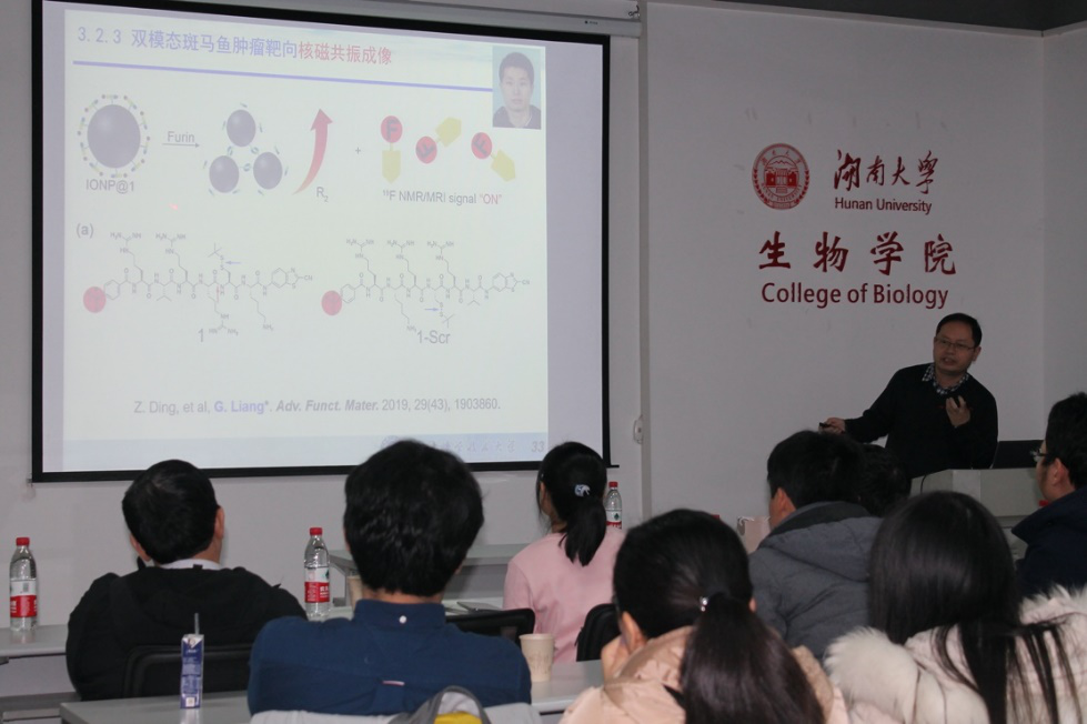 12月28日,中国科学技术大学化学系教授,博士生导师梁高林教授应邀来新葡官网进行学术交流与访问,并作了精彩的学术报告,报告题目为“细胞内自组装在生物成像分析中的应用”,何晓晓院长主持报告。