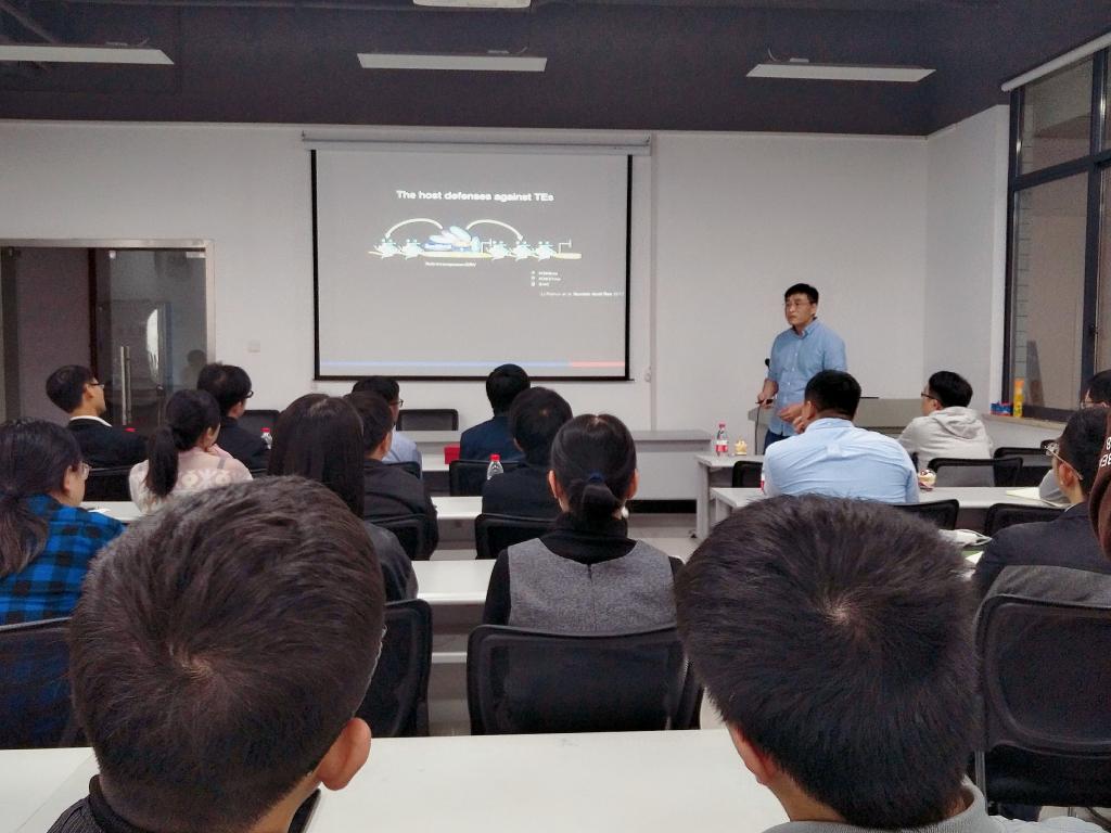 袁教授的报告新颖有趣,他首先给大家推荐了一本与生物进化相关的英文书籍《The Selfish Gene》,并以此为引子,过渡到其科研领域:DNA重复序列在真核胚胎发育和癌症表观遗传调控中的关键作用。袁教授分别介绍了PRC complex介导的H3K27me3在果蝇早期胚胎发育(细胞分裂)中的重要作用,以及结直肠癌中DNA重复序列受SWI/SNF complex调控重新激活的故事。袁凯教授的精彩报告引起了在场师生们的广泛讨论和积极提问,体现了新葡官网蒸蒸日上的良好科研风气,最后讲座在一片掌声中结束。