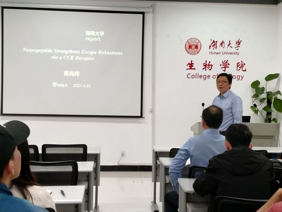 2021年4月29日下午15:00,华中科技大学生命科学与技术学院高尚邦教授应邀来新葡官网做学术交流,并做了题为Neuropeptide strengthens Escape Robustness via a CCK Receptor的讲座。该讲座在3003新葡官方网站U型楼B111举办,由3003新葡官方网站涂海军教授主持。学院里众多老师和学生参加了该讲座。