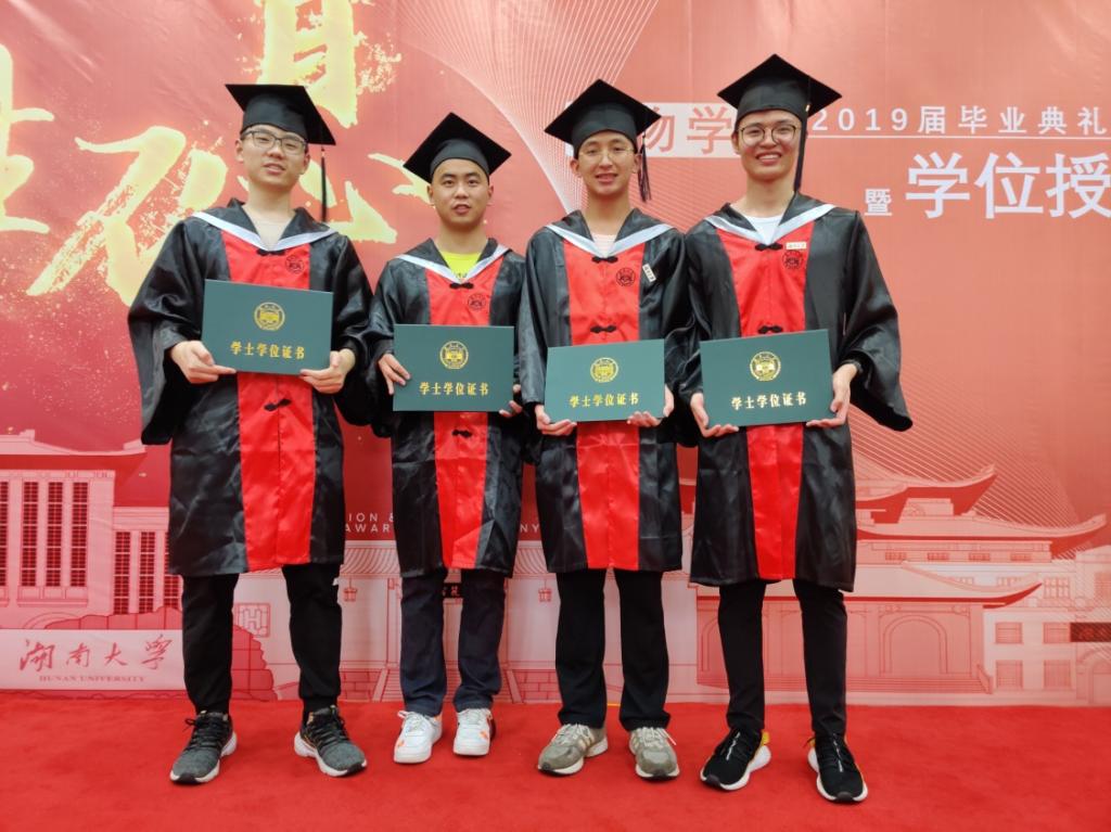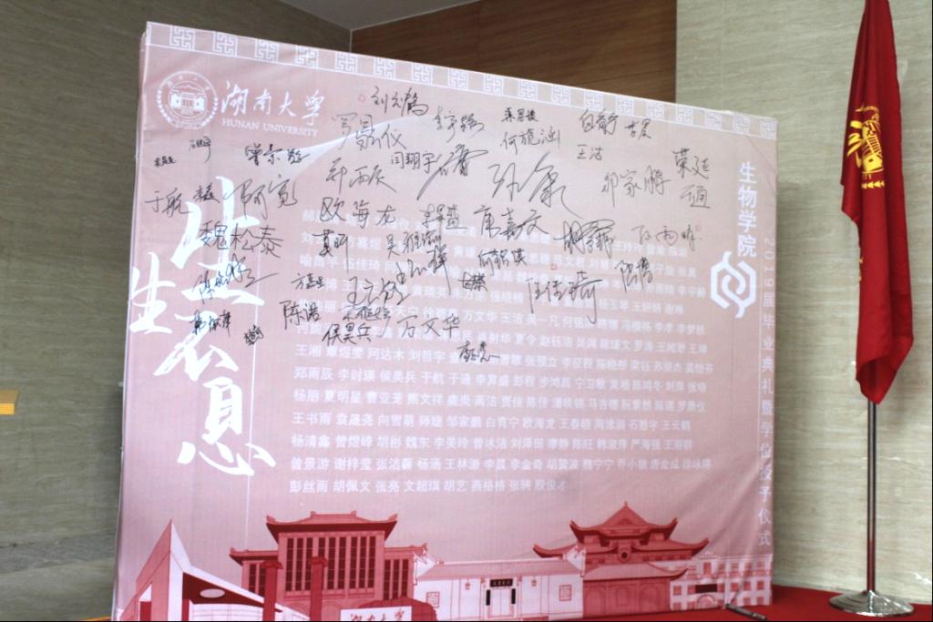 “麓山巍巍,湘水泱泱;宏开学府,济济沧沧……”在恢弘的校歌声中,全体师生歌颂母校。最后毕业生们合唱张震岳的《再见》,并纷纷来到学院设置的签名板前合影留念,表达对挚爱母校的深情,毕业典礼也在歌声中落下帷幕。