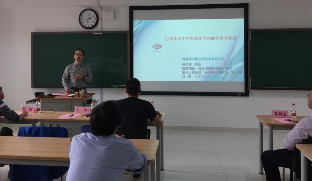5月14日下午, 湖南福来格生物技术有限公司总裁许岗先生携研发、生产与检测等部门负责人以及福来格全资子公司湖南宝利士生物技术有限公司负责人等一行五人来3003新葡官方网站考察与交流。下午两点三十分,许岗先生与部门负责人在研究生院A402教室分别就生物技术生产医药化学品的优势及特点,工业酶的挖掘及分子改造(基因工程技术),酶制剂产品的高效生产(酶生产工艺开发和产业化),酶法制备非天然氨基酸(生物催化技术),在生物产业中建立确实可行的分析方法(分析技术)等五个方面为3003新葡官方网站师生做了主题讲座,使学院师生不仅对酶制剂的研发与工业化生产及其在医药产业中的优势与产业价值有一个全面的了解和认识,而且拓展了师生们在医药酶制剂相关产品的创新研发及其相关科技成果转化等方面的视野和思路。