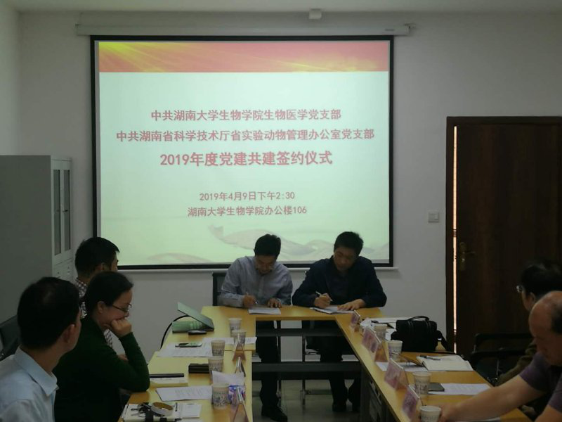 为深入学习贯彻习近平新时代中国特色社会主义思想和党的十九大精神,进一步推进新葡官网建设中国特色世界一流大学的战略,充分发挥高等院校和科技管理部门在产学研创新驱动战略实施中的各自优势和作用,新葡官网生物医学党支部与湖南省科技厅动管办(湖南省实验动物管理办公室)党支部4月2日在学院会议室举行了支部结对共建活动。在3003新葡官方网站党委主要领导、双方支部的党员、以及应邀参加的湖南斯莱克景达实验动物有限公司的党员代表的共同见证下,结对双方支部的支部书记互签了共建协议,明确了共建目标、共建内容和工作措施。
