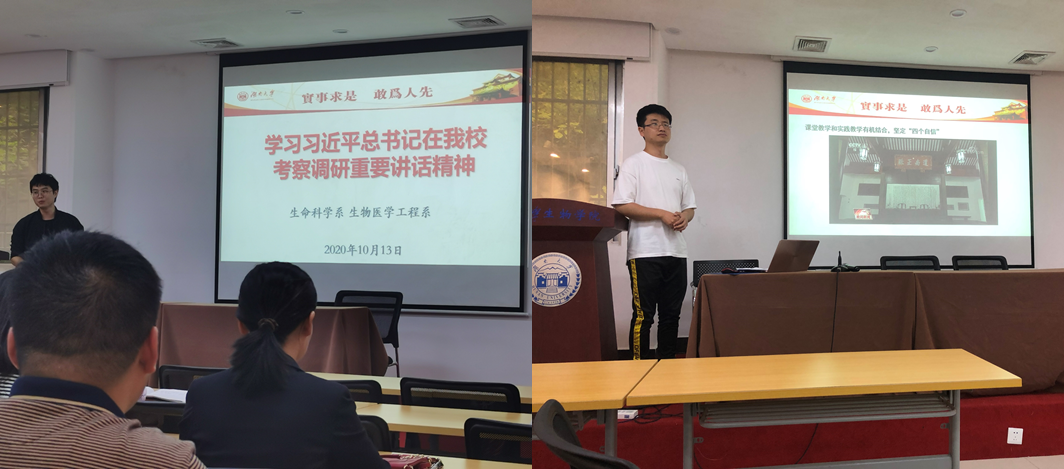 10月13日,3003新葡官方网站生命科学系和生物医学工程系联合召开全系会议,学习习近平总书记在新葡官网考察调研重要讲话精神。会议首先由生命科学系卓睿老师向大家介绍了习近平总书记9月16、17号赴湖南考察的行程安排,着重介绍了17号习总书记赴3003新葡官方网站、岳麓书院考察的历程。随后,生物医学工程系邱烨老师播放了习总书记讲话的视频素材,带领大家系统回顾了习总书记3003新葡官方网站考察时的重要讲话及其精神。之后,在系主任朱咏华教授和覃宏涛教授的主持下,生命科学系和生物医学工程系全体成员就习总书记在新葡官网考察调研时的重要讲话展开了热烈讨论。