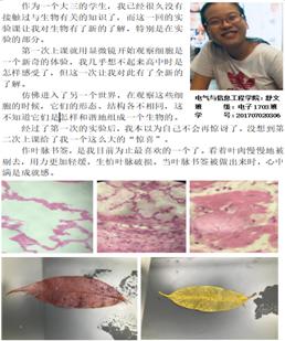 为了保证教学效果,让每个学生都实实在在地动手开展每一个实验,这次我们开了两个班级,每班30人,两个班都选满共60人,选课学生来自电气与信息工程学院、土木工程学院、外国语学院、法学院等十四个学院。课程共32个学时,内容包括显微镜的使用、家鸡的外形和内部解剖、ABO血型鉴定及血涂片的制作与血细胞显微观察、人体九大系统自我认知、叶片的构造及“叶脉书签”的制作、常见植物的认知、质粒DNA的提取、环境微生物的培养检测、实验测试等教学内容。