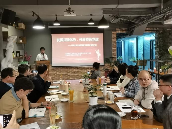 会中,生物医学工程支部宣传委员邱烨介绍了本支部创建和发展首批全国党建工作样本支部和首批全国“双带头人”工作室的历程和经验,突出了新葡官网党建工作重视思想政治建设、紧密结合科研工作和产-学-管联动的特色,获得了与会同志的好评。随后,外国语学院课程思政先进工作者、全国课程思政比赛特等奖获得者任远老师围绕课程思政要点,详细进行了经验分享和交流。基于任远老师的分享,双方就党史教育和课程思政问题展开了进一步的交流和学习。