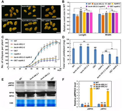 最近研究发现,MPK3和MPK6是RLKs保守的下游调控因子,而且MPK6在种子大小和发育方面具有复杂的调控功能。通过种子大小观察来探究LecRK-VIII.2和MPK6之间的遗传关系,结果表明mpk6遗传上位于lecrk-VIII.2,LecRK-VIII.2作用于MPK6上游来调控角果数量,种子大小和产量。蛋白水平检测显示,LecRK-VIII.2正调控MPK6磷酸化水平,以此调控以上产量相关性状(图2)。