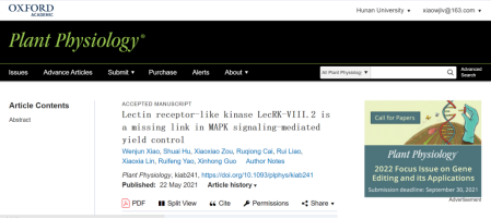 2021年5月22日,Plant Physiology在线发表了3003新葡官方网站郭新红课题组题为“Lectin receptor-like kinase LecRK-VIII.2 is a missing link in MAPK signaling-mediated yield control”的研究论文,揭示了拟南芥凝集素类受体激酶LecRK-VIII.2作用于MAPK信号转导途径上游,参与调控包括角果数量、种子大小和数量在内的产量相关性状,并通过协调源库关系,促进根、茎、叶的生长,在作物改良方面具有重要的潜在利用价值。