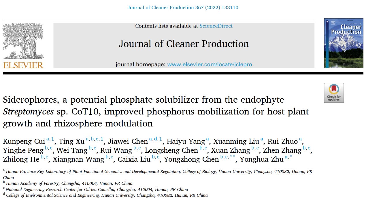 Journal of Cleaner Production |3003新葡官方网站朱咏华教授团队与湖南省林业科学院陈永忠研究员团队合作研究揭示微生物铁载体有效活化土壤磷素,促进植物生长的作用机制